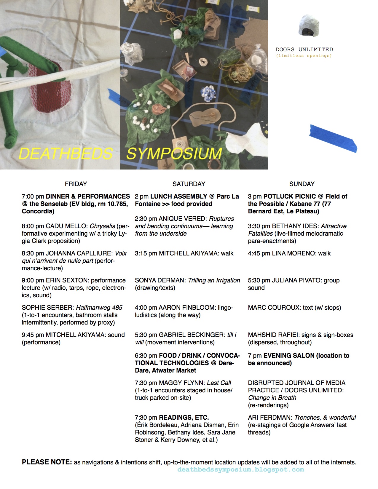 throughout the symposium (http://deathbedssymposium.blogspot.ca.), to have materials at the ready during shared meals & on walks, all during the elastic “down” time(s).