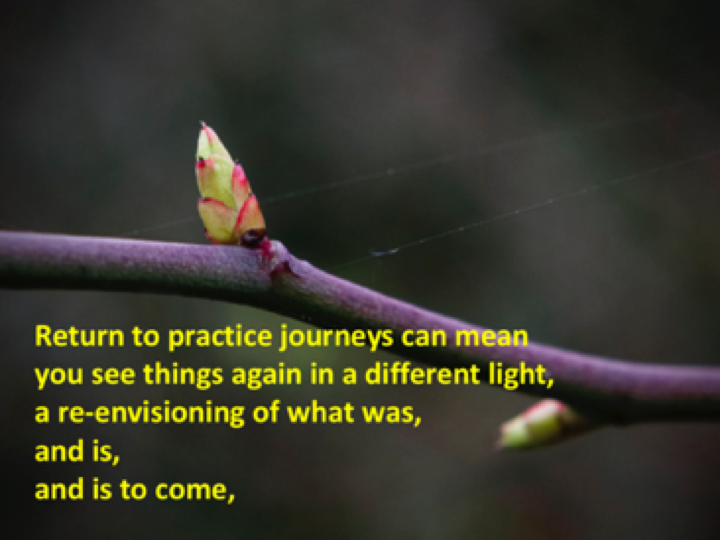 This autoethnographic inquiry employs bricolage, drawing on theory and hybridized methods, inspired by the notion of ‘returning to practice’. The conversations of Karen and Katherine (mentee and mentor) as qualitative data, analyzed, interpreted and made accessible through poetry and images – along with Peter’s musical and autobiographical compositions – explore possibilities to re-examine and share alternative avenues of scholarship and theoretical understanding, not least in redefining what contribution to knowledge that artistic processes and ‘artwork’ makes methodologically, pedagogically, aesthetically, and therapeutically. Our intention is to engage the reader-viewer-listener to (re)think, take notice, disrupt, re-examine and extend personal meanings about return to practice journeys, enabling each of us to benefit and be (re)inspired.